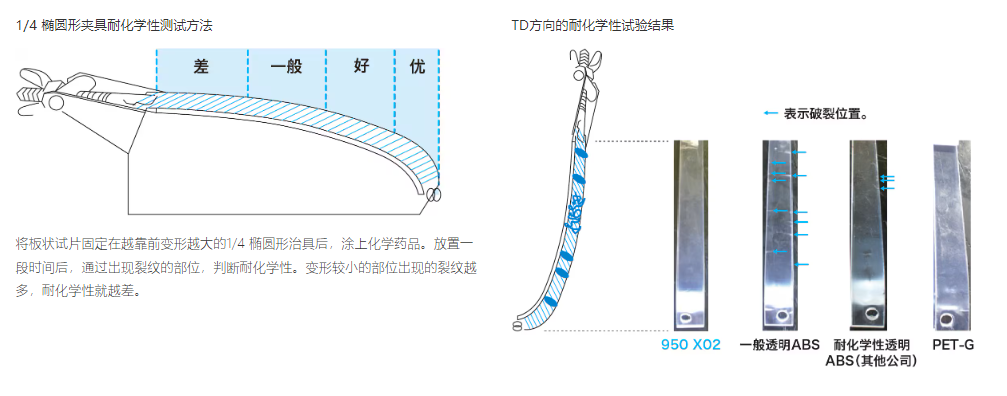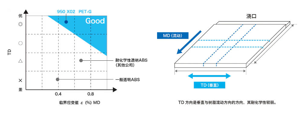 成型品有兩個(gè)方向:TD(垂直)和 MD(流動(dòng)),TD 的耐化學(xué)性較弱。TOYOLAC™ 950 X02 背后的技術(shù)顯著提高了 TD 產(chǎn)品的耐化學(xué)性。TOYOLAC™ 950 X02 是唯一一款具有PET-G(廣泛認(rèn)為具有良好耐化學(xué)性)同等的耐化學(xué)性的材料,但其比重相對(duì)較低,有助于節(jié)省成本和降低注塑缺陷率。