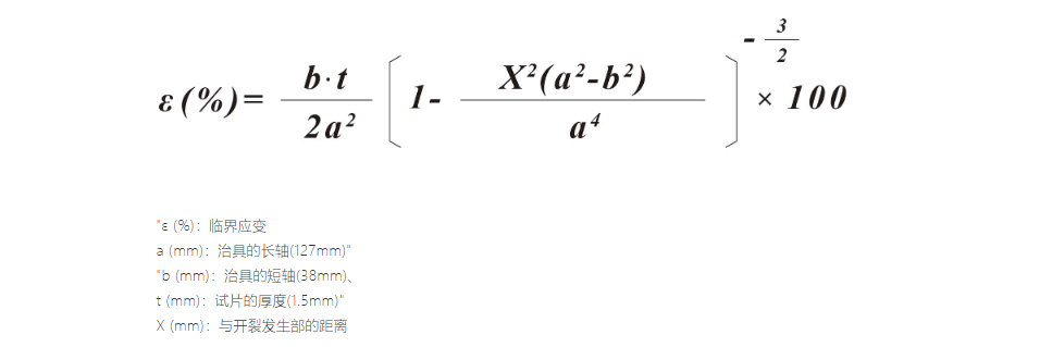 將實(shí)施過(guò)1/4 橢圓形治具耐化學(xué)性試驗(yàn)(圖)的試片,強(qiáng)行彎曲,根據(jù)試片表面產(chǎn)生的裂紋部位算出臨界應(yīng)變值(ε)。臨界應(yīng)變值是根據(jù)開(kāi)裂的產(chǎn)生位置算出來(lái)的,且該值越大,表示耐化學(xué)性越好。