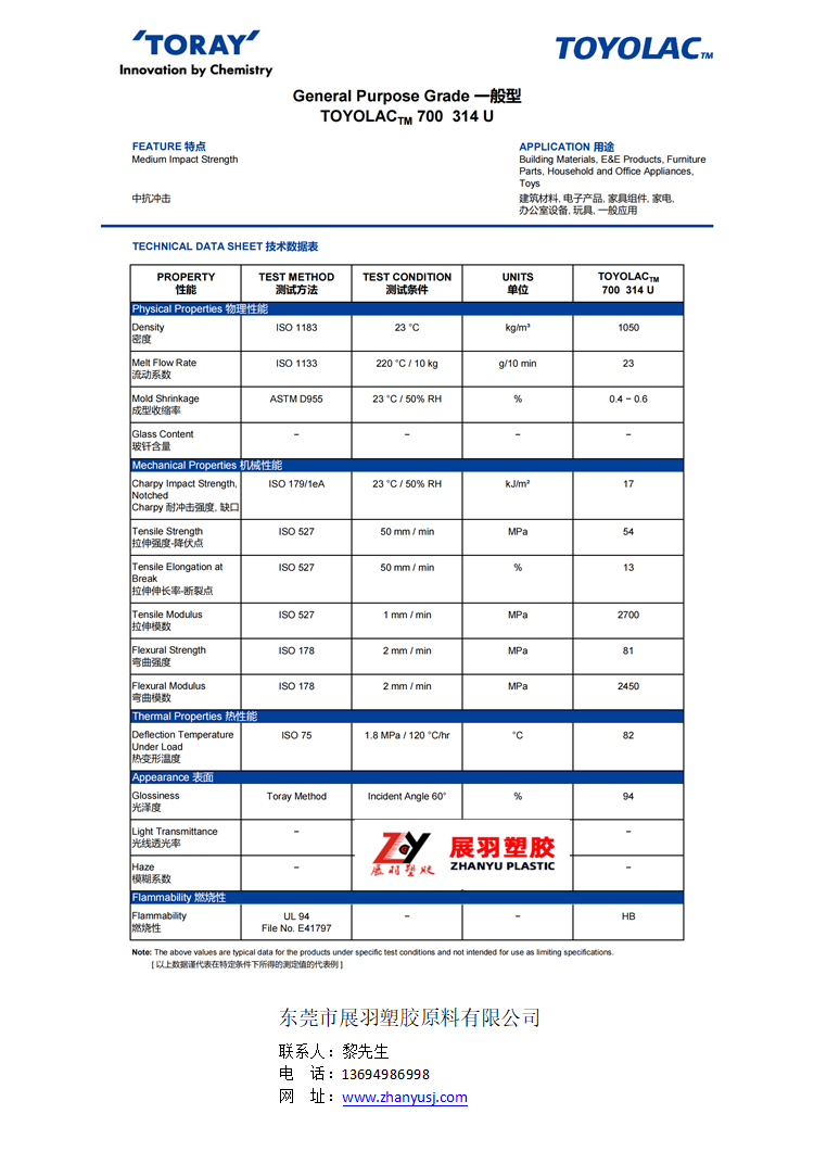 ABS 東麗 Toyolac 700 314 U 中等沖擊 建筑材料 電子產(chǎn)品 辦公室設(shè)備 玩具應(yīng)用