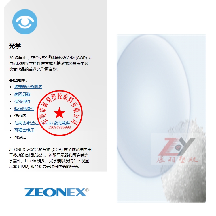 Zeon Chemical 的 ZEONEX? F52R 是一種不溶于水、無味、無色的環(huán)烯烴聚合物 (COP) 牌號。具有高玻璃化轉(zhuǎn)變溫度、低絕對熱光系數(shù) (dn/dT)、低雙折射和低吸水率。具有優(yōu)異的光學(xué)性能、高透明度、高阿貝數(shù)、超低吸濕性和良好的精密成型性。在熱和濕暴露后提供優(yōu)異的光學(xué)穩(wěn)定性。可采用注塑加工。ZEONEX? F52R 建議用于汽車平視顯示器 (HUD)、駕駛員輔助攝像頭、移動設(shè)備攝像頭鏡頭、近眼顯示器、可穿戴光學(xué)器件和 f-theta 鏡頭的光學(xué)鏡和鏡頭。