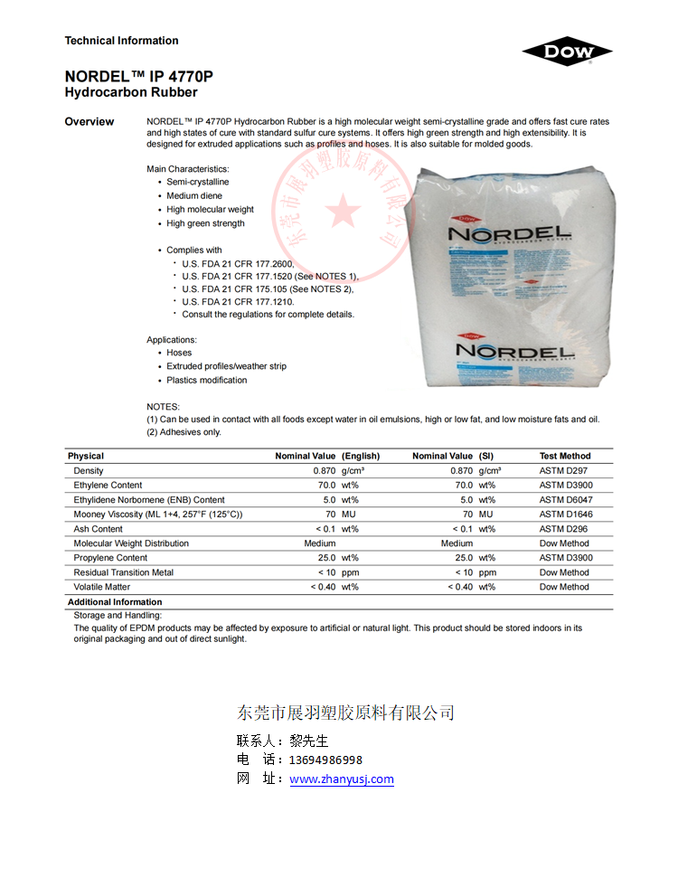 NORDELIP 4770P 美國陶氏 EPDM 高分子量 半結(jié)晶 三元乙丙橡膠