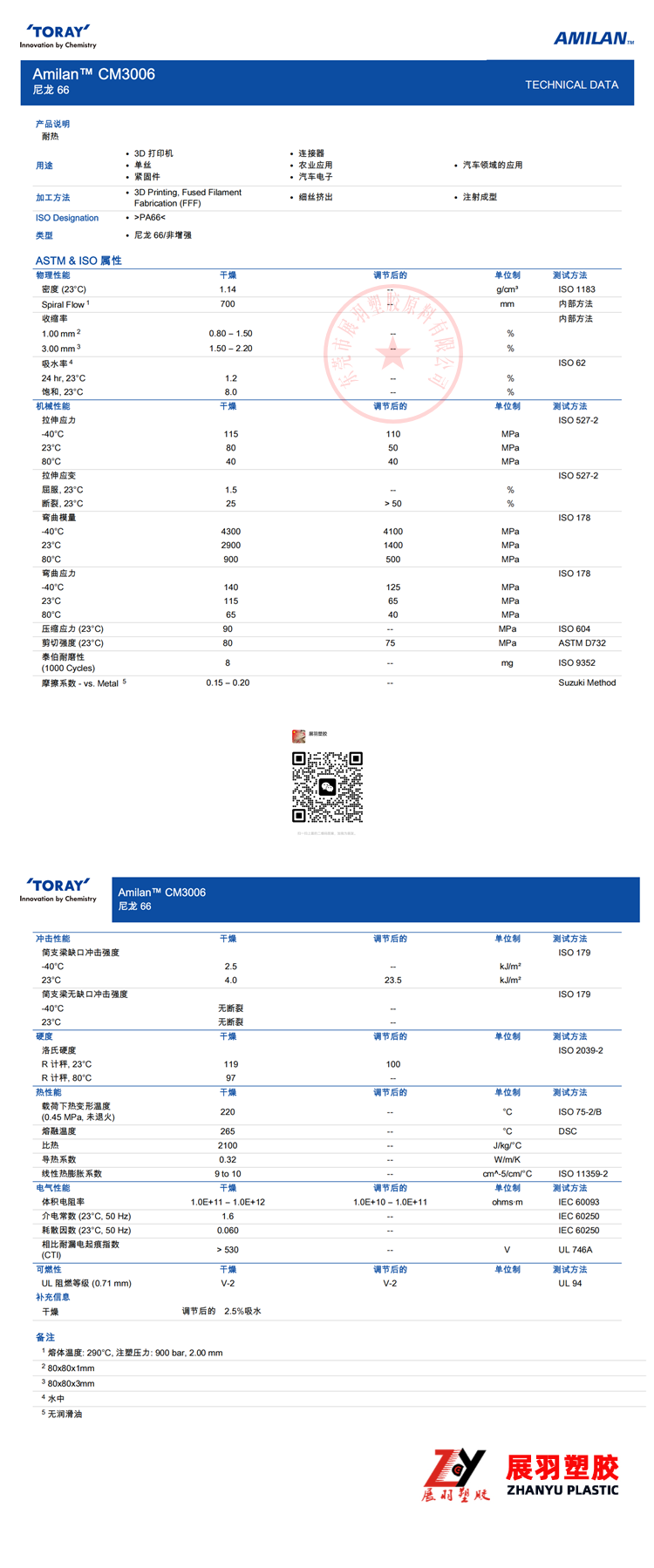 產(chǎn)品簡介:PA66 東麗 Amilan CM3006 高流動性 耐熱級 尼龍66 非增強(qiáng) 聚酰胺66 注塑成型AMILAN® CM3006 是一種熱穩(wěn)定聚酰胺66 (PA 66) 等級。具有高流動性、優(yōu)異的強(qiáng)度、韌性及抗摩擦磨損性能。具備良好的機(jī)械性能和優(yōu)越的氣...
