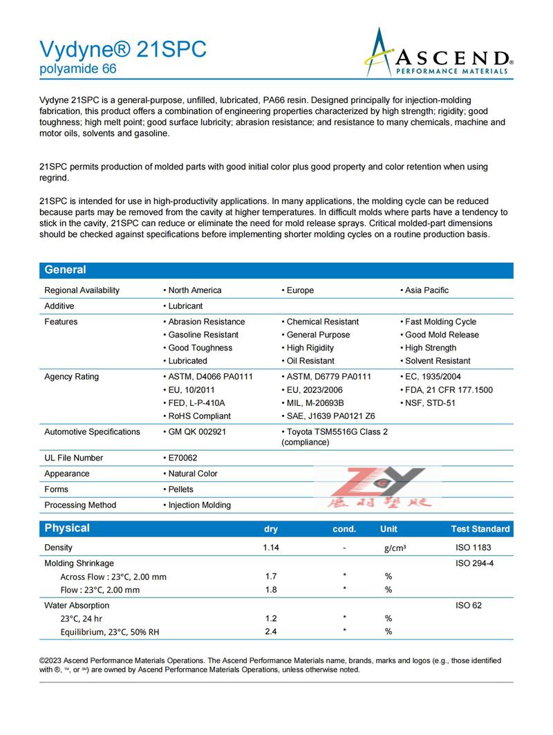 Vydyne 21SPC是一種通用型、未填充、潤滑的PA66樹脂。該產(chǎn)品主要用于注塑成型制造,具有高強、剛性、良好的韌性、高熔點、良好的表面潤滑性、耐磨性以及對許多化學品、