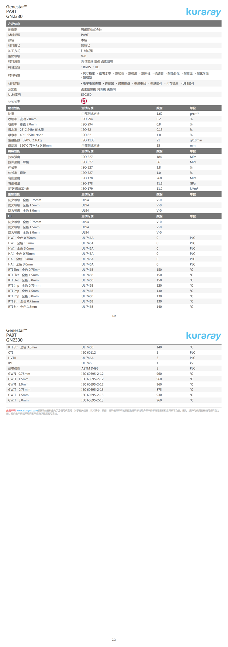 可樂麗 Genestar™ PA9T GN2330 >PA9T-GF33-FR(17)< 阻燃等級(jí): V-0 缺口沖擊: 11.2 kJ/m2 符合規(guī)定: RoHS ? UL