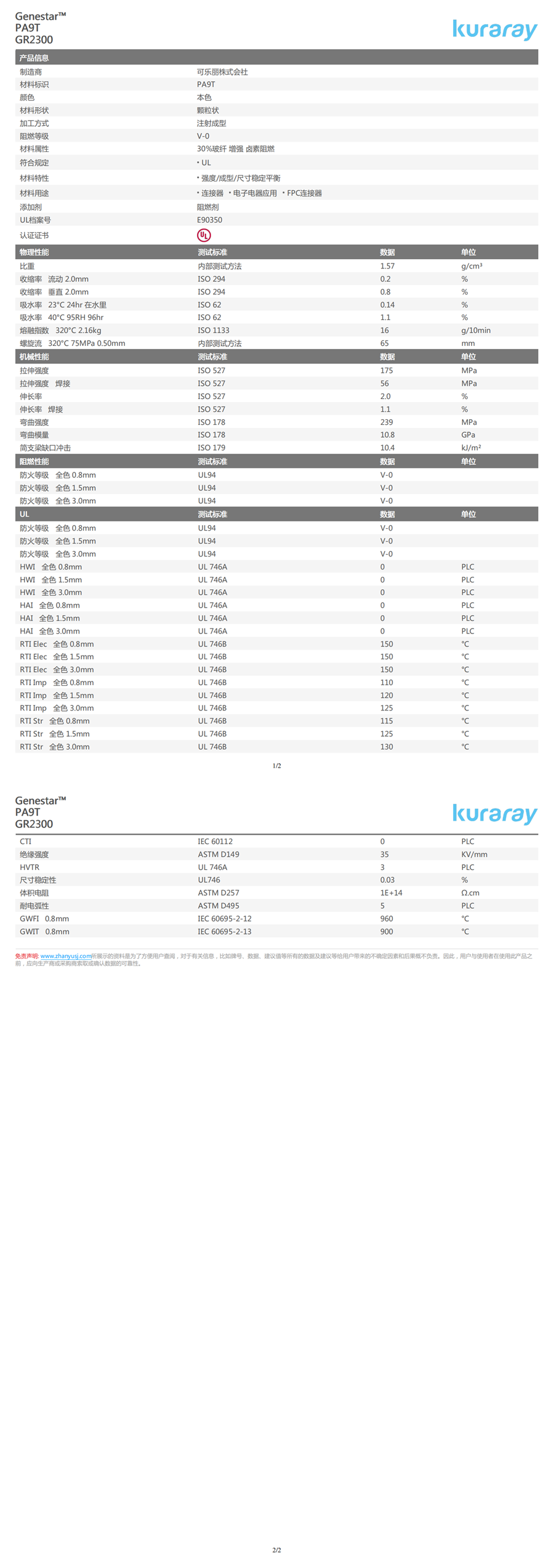 PA9T 可樂(lè)麗 Genestar GR2300 標(biāo)準(zhǔn) 鹵素阻燃V-0 玻璃含量30% 電子電器應(yīng)用