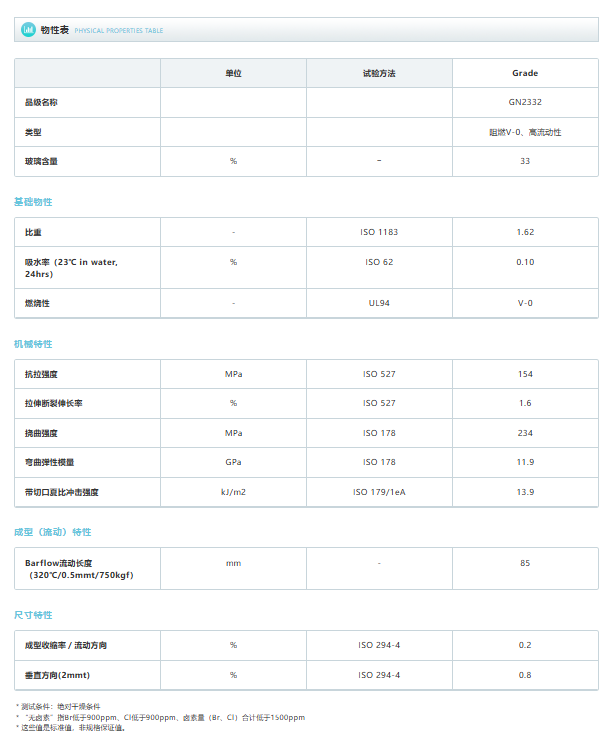 日本可樂麗公司的GENESTAR? GN2332是一種含33%玻璃纖維增強的高流動性聚酰胺9T (PA 9T)級材料。它是阻燃的。