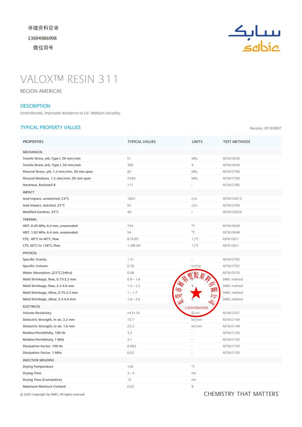 SABIC 的 Valox 311 是一種聚對(duì)苯二甲酸丁二醇酯 (PBT) 樹(shù)脂。具有紫外線和天氣穩(wěn)定性。 Valox 311 適用于注塑加工。