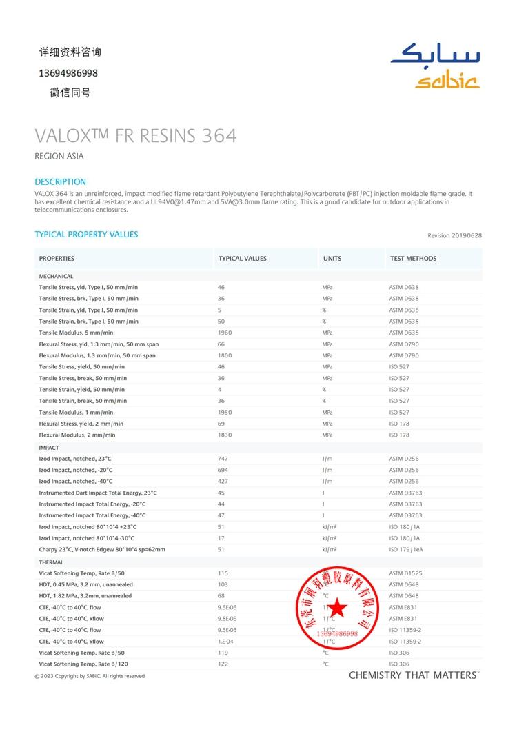 VALOX 364 SABIC 阻燃UL-94 (V0) 聚對苯二甲酸丁二醇酯 (PBT) 樹脂