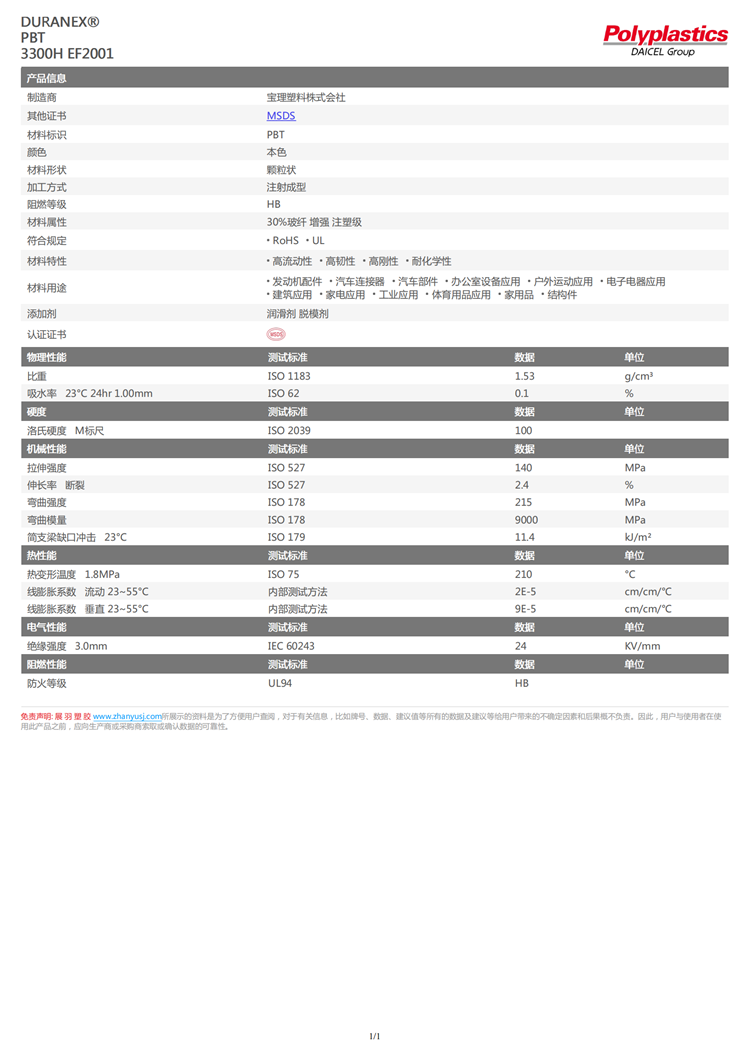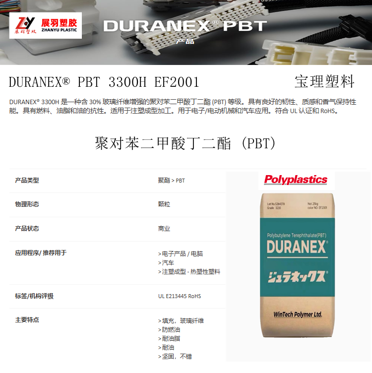 DURANEX® PBT 3300H EF2001 玻纖30% 防燃油 耐油脂 電子電動和汽車應用