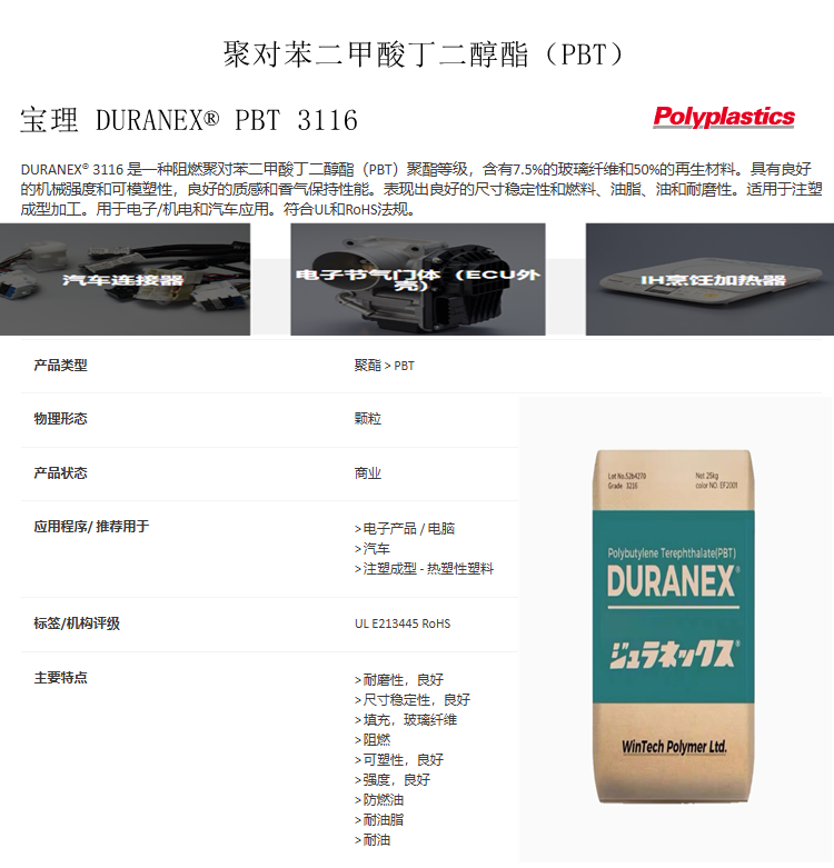 寶理 DURANEX® PBT 3116 鹵素阻燃V0 玻纖增強(qiáng)7.5% 聚對(duì)苯二甲酸丁二醇酯