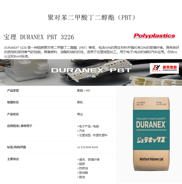 DURANEX PBT 3226 日本寶理 >PBT-GF20-FR(17)< 阻燃等級(jí): V-0 ? 5VA 缺口沖擊: 8 kJ/m2 符合規(guī)定: RoHS ? UL