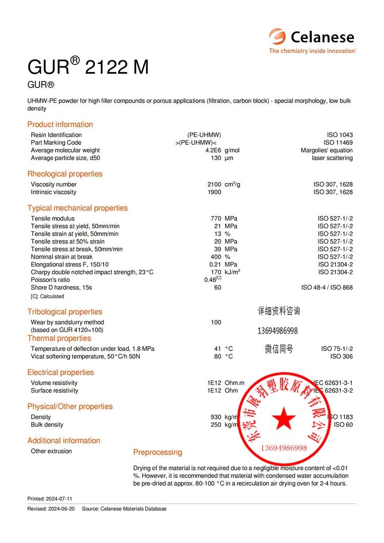 美國塞拉尼斯 GUR 2122 M 超高分子量聚乙烯 低堆積密度 UHMW-PE 粉末級
