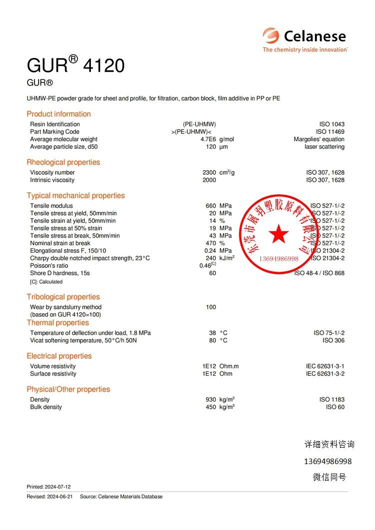 Celanese 的 GUR? 4120 是一種自潤滑線性超高分子量聚乙烯 (UHMWPE),使用 Margolies 方程計算,分子量約為 4.5 MM g/mol。加工后具有出色的耐磨性、高沖擊強(qiáng)度、低摩擦系數(shù)和不粘表面。