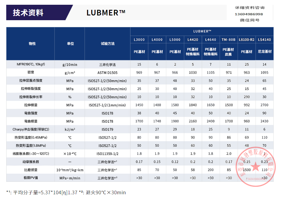 LUBMER L4640 日本三井 UHMWPE 超高分子量聚乙烯 無(wú)鹵素 全氟辛烷磺酸填充型