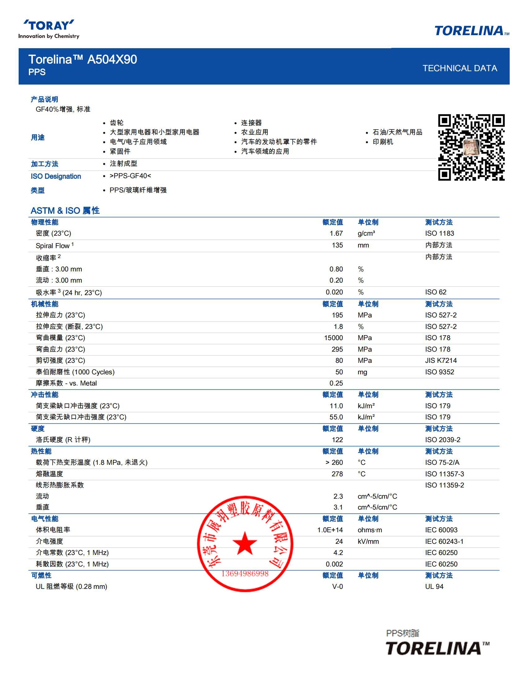 TORELINA A504X90 Toray 阻燃性 耐化學性 40%玻璃纖維 聚苯硫醚(PPS)