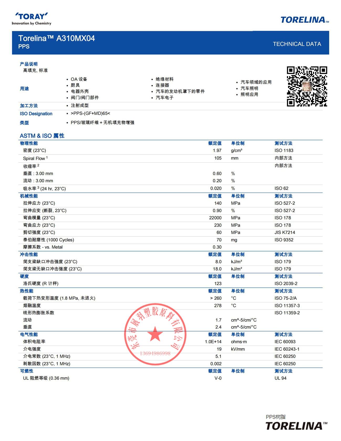 TORELINA A310MX04 Toray 日本東麗 PPS-(GF+MD)65 阻燃V0 聚苯硫醚