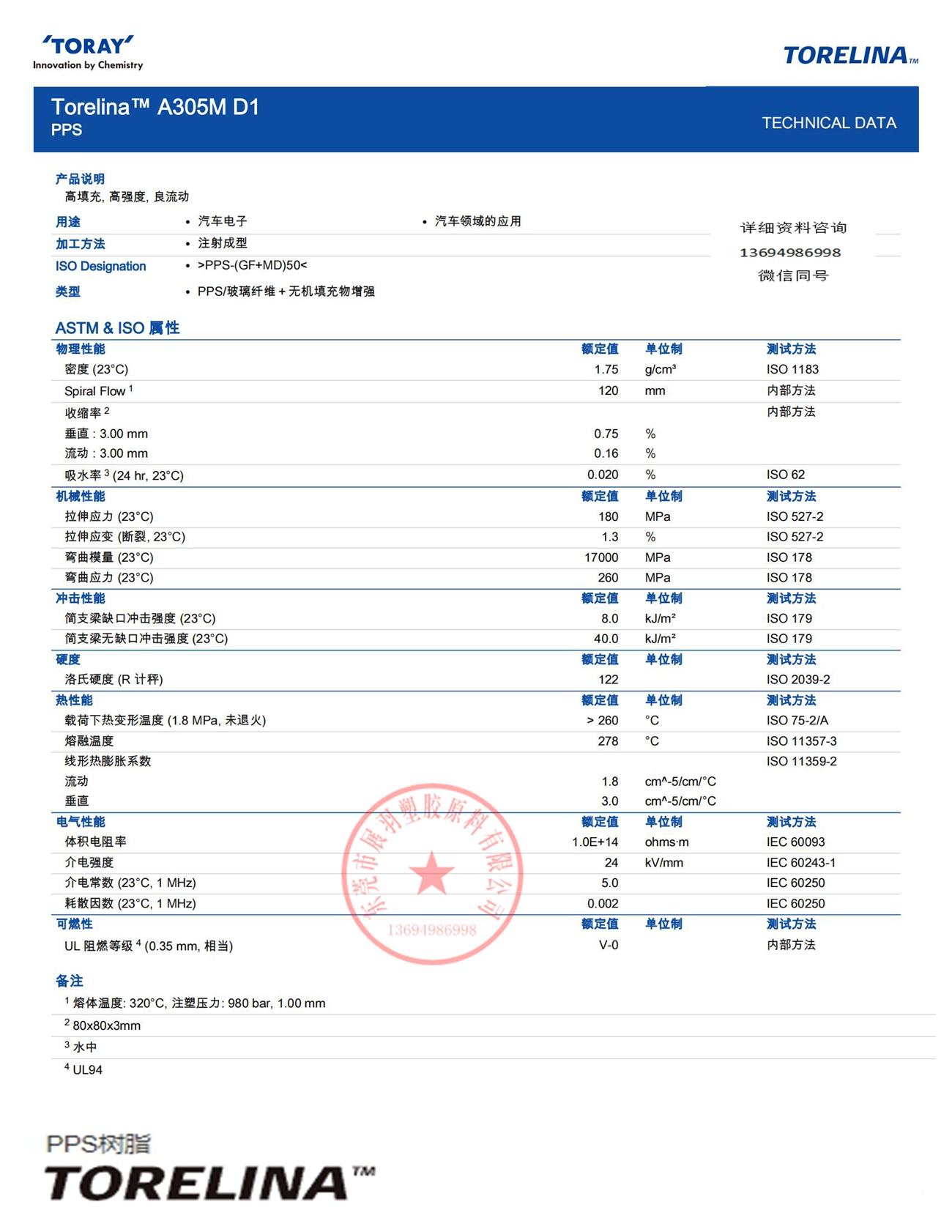TORELINA A305MD1 Toray 高流動性 阻燃性 50%礦物和玻璃 聚苯硫醚 (PPS)