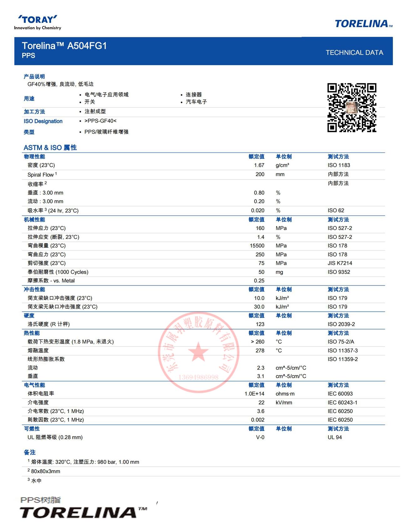 Torelina A504FG1 Toray PPS玻璃纖維 GF40%增強(qiáng) 低毛邊 聚苯硫醚 (PPS)