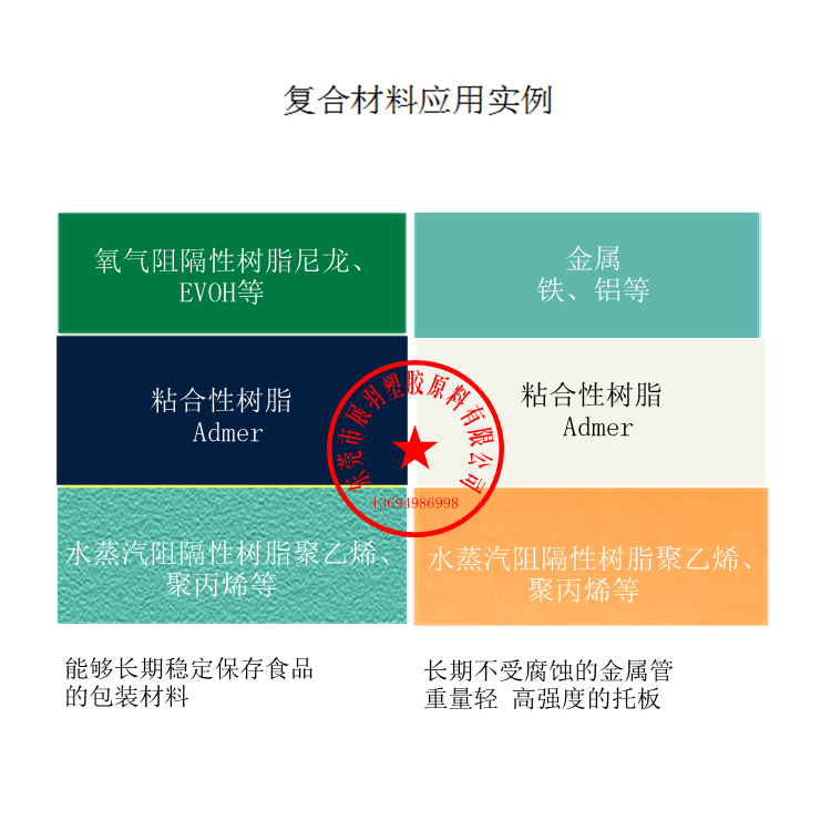ADMER™,是由改性聚乙烯、改性聚丙烯組成的一種改性聚烯烴,由于在聚烯烴鏈上引入了粘合性官能團,使之在與EVOH等空氣阻斷樹脂、金屬、玻璃纖維、陶瓷等粘合時擁有特強的粘合性。通過共擠出成型,可以制作多層的片材、薄膜、管材、瓶材等多種制品。