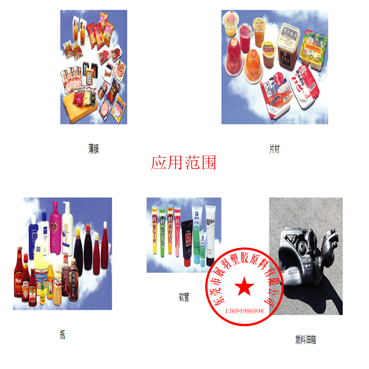 燃料油箱、食品瓶罐、化妝品瓶、食品軟管、化妝品軟管、食品包裝用片材、食品包裝用薄膜。