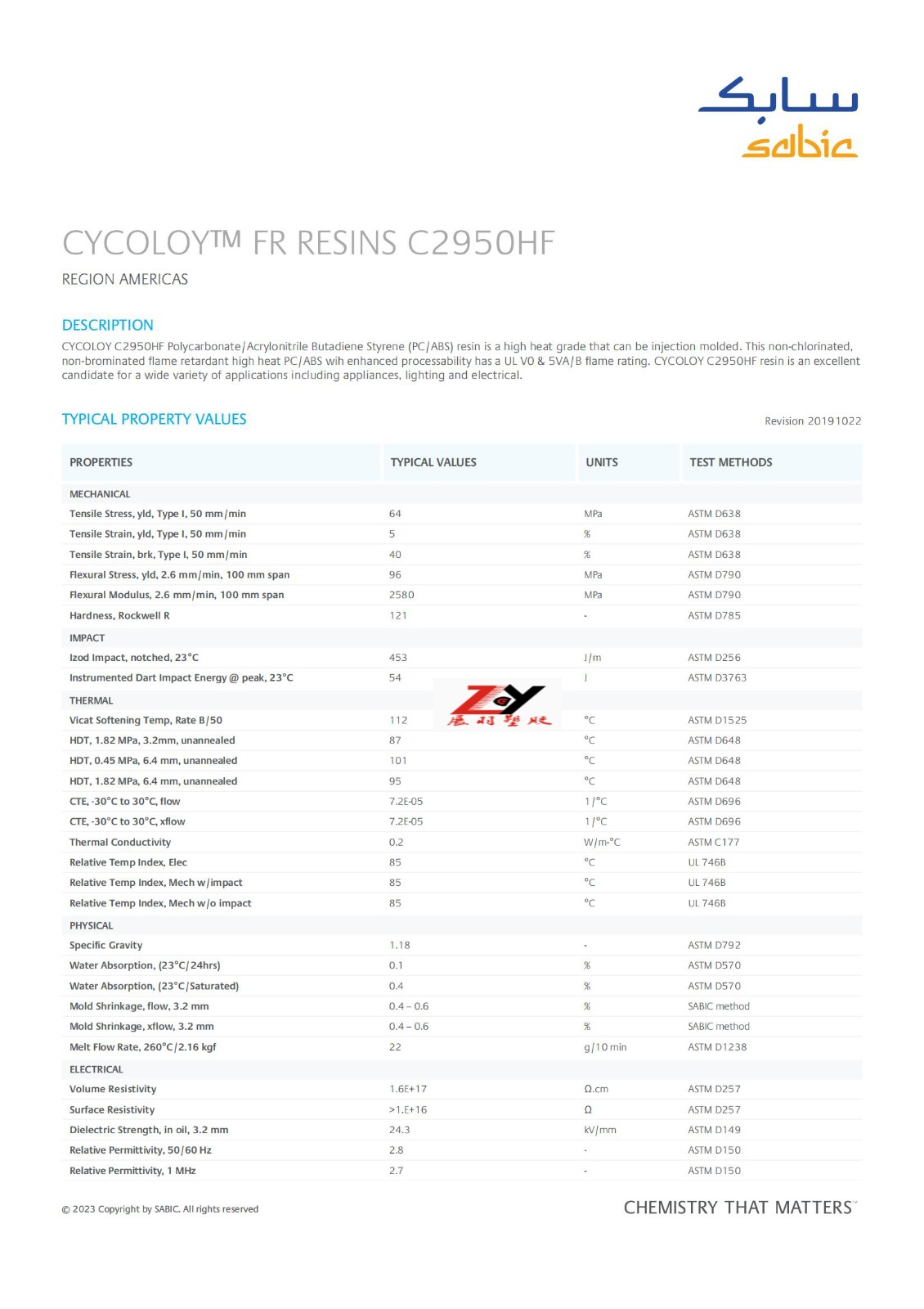 CYCOLOY  C2950HF 英文物性表 沙特PC/ABS,沙伯基礎(chǔ)PC/ABS物性數(shù)據(jù),PC/ABS物性表,PC+ABS物性數(shù)據(jù),聚碳酸酯+丙烯腈丁二烯苯乙烯