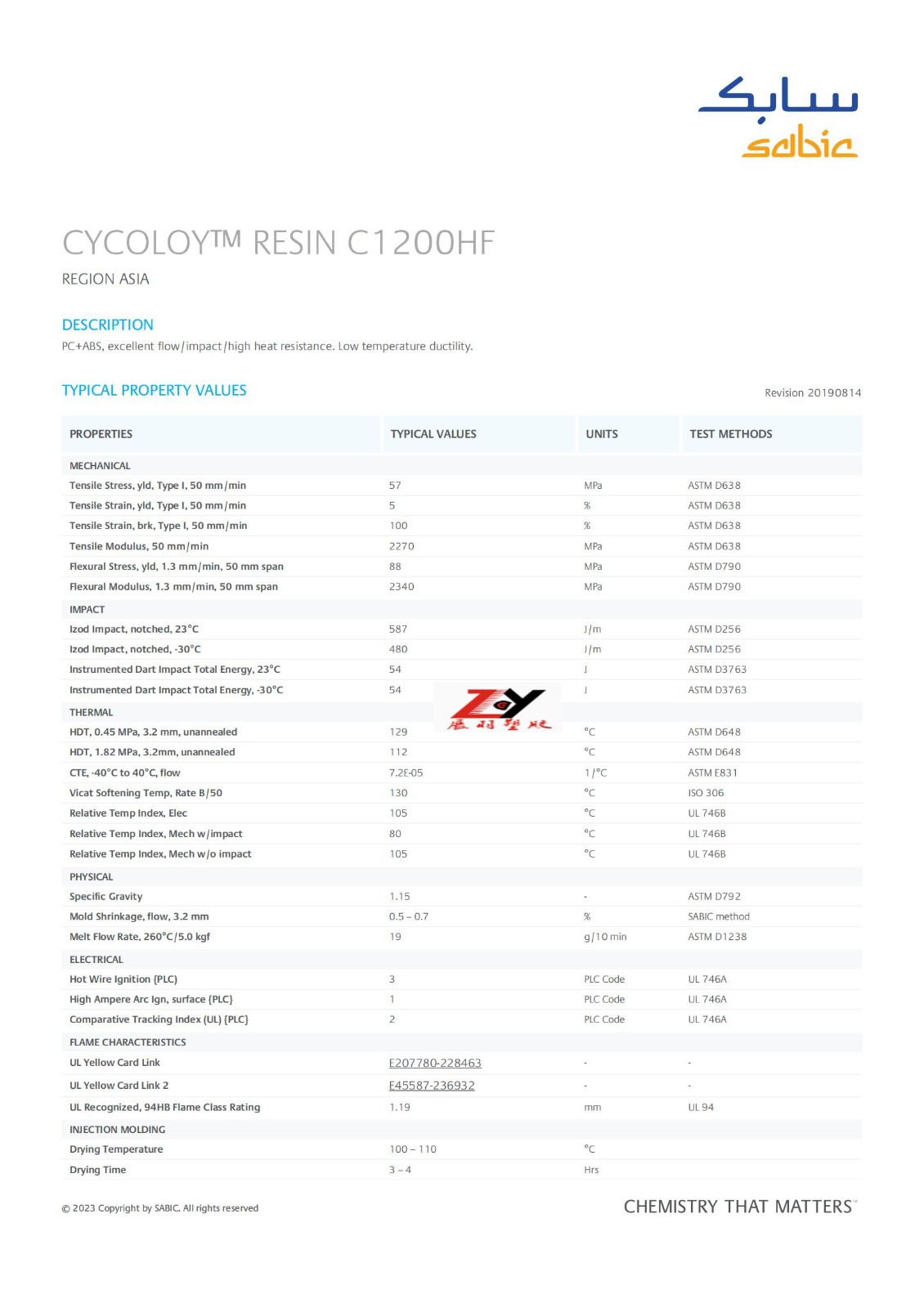 CYCOLOY C1200HF物性參數(shù)表 沙伯基礎(chǔ)PC/ABS,CYCOLOY? RESIN C1200HF,PC/ABS物性表,聚碳酸酯+丙烯腈丁二烯苯乙烯