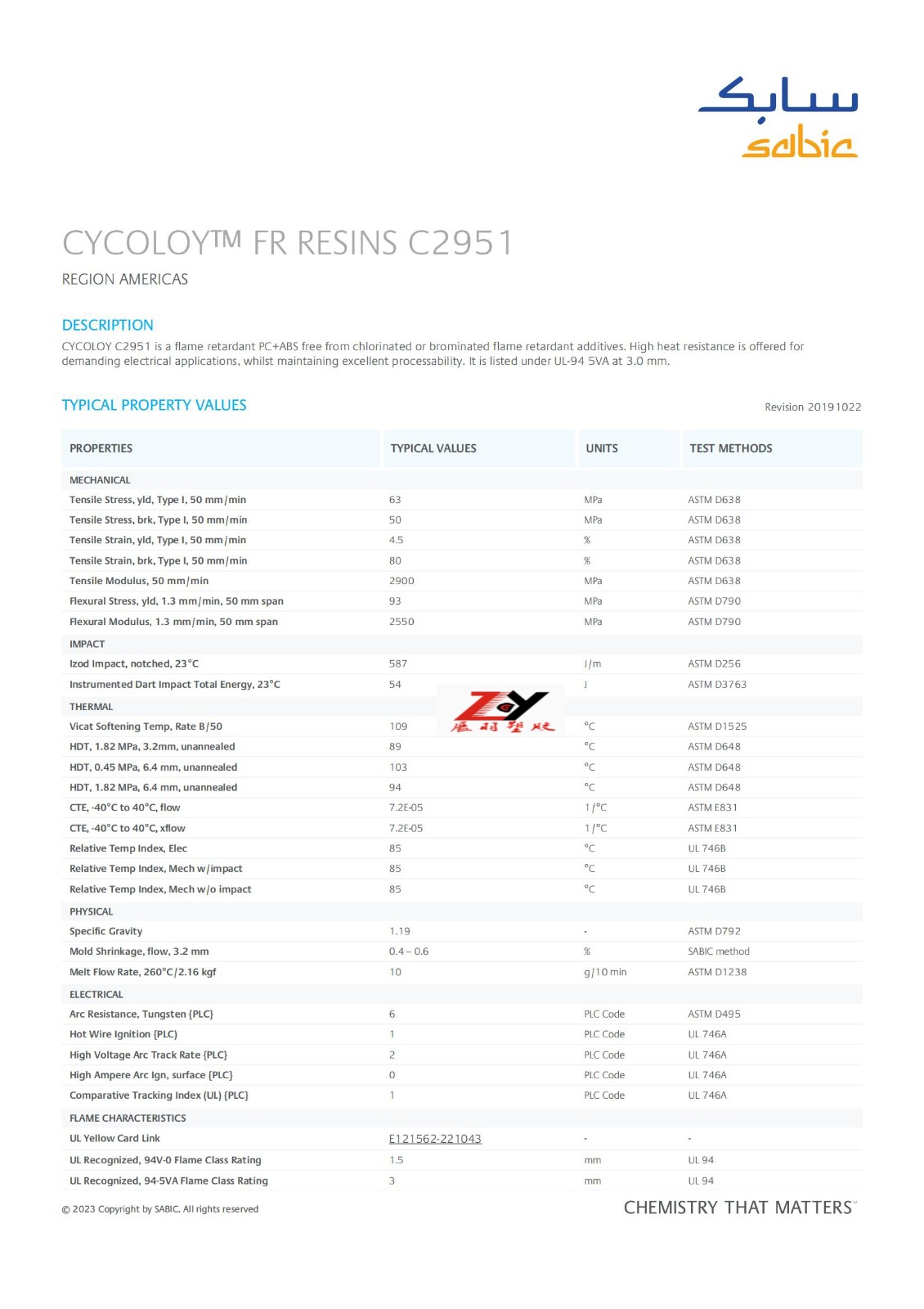 CYCOLOY C2951物性參數表 PC/ABS物性數據,PC/ABS物性表,PC+ABS物性表,沙特PC/ABS,聚碳酸酯+丙烯腈丁二烯苯乙烯